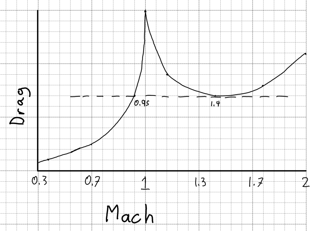 The other version of low boom is that air get’s colder as you go up, so if you go between Mach 1 and Mach 1.1, you make a sonic boom, but the temperature gradient bends the sound back up so it never reaches the ground. This sounds like a great way to go a little faster over land, but that’s in the Mach 0.98-1.2 ish range where drag is really high, so you get horrible fuel efficiency and need much more powerful engines.
