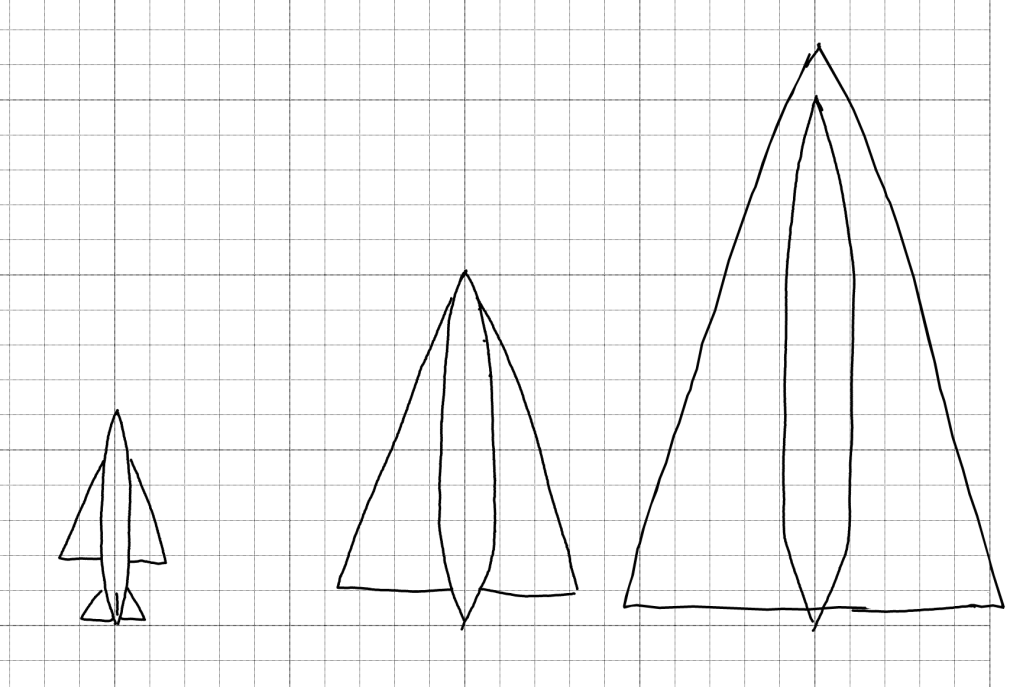 That means that to fly efficiently at a given Mach number, there’s a minimum wing sweep angle equal to the Mach angle. Wings that have a higher sweep angle tend to produce less lift per area at a given speed. The maximum wing area, a delta wing with the minimum sweep angle that’s the length of the plane, also gets smaller as the minimum sweep increases. Since you need enough lift at a safe takeoff and landing speed, that effectively puts a maximum size on the plane that gets smaller as it’s cruise speed increases.