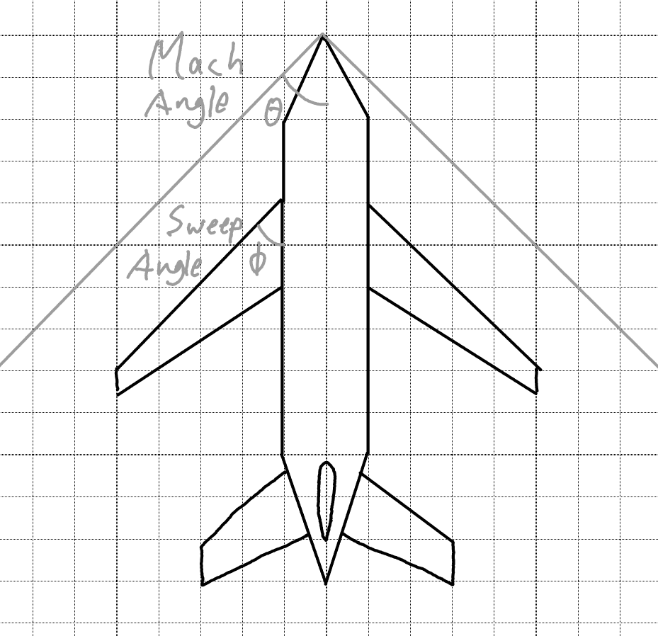 When something goes faster than the speed of sound, it creates a shock wave. The angle of that shockwave depends on the Mach number. That angle is basically just trigonometry saying, at what angle is the component of airspeed perpendicular to the surface equal to Mach 1. If you have something like a wing that’s swept back less than the Mach angle, you get a big draggy bow shock in front of the leading edge.